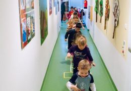 Seit Jänner haben wir im Kindergarten Neue Heimat eine Hüpfstraße, die in einem Rundgang durch das ganze Haus führt.