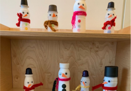 Die Kinder gestalten Schneemänner aus alten Plastikflaschen.