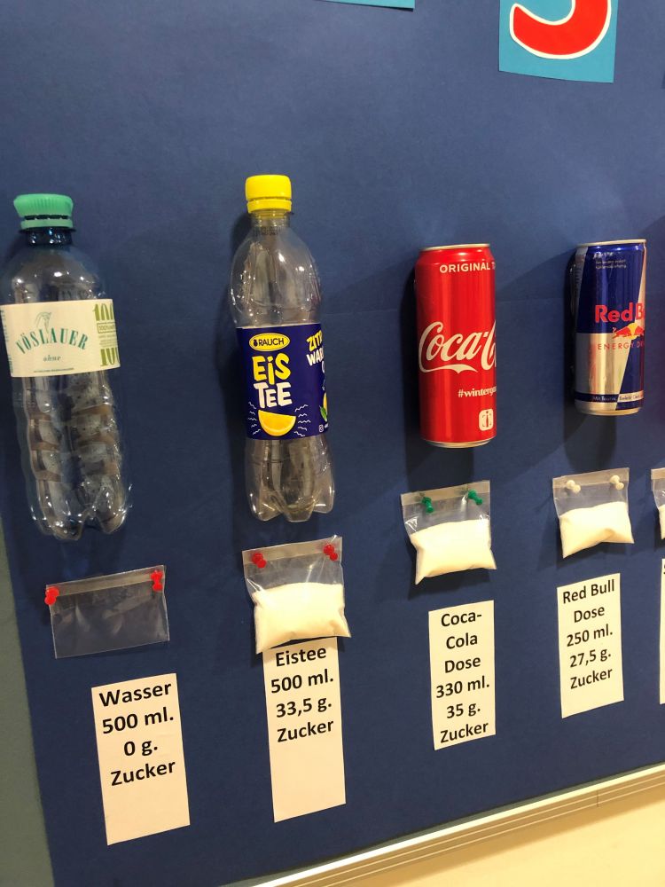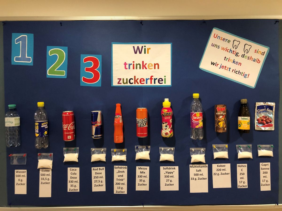 Die Kinder haben unsere Wassertrinkstation in der Gruppe toll gefunden. :-) Jetzt sind wir dabei, anhand eines großen selbstgestalteten Plakates den Kindern zu veranschaulichen, dass in den meisten Getränken sehr viel Zucker enthalten ist.
