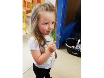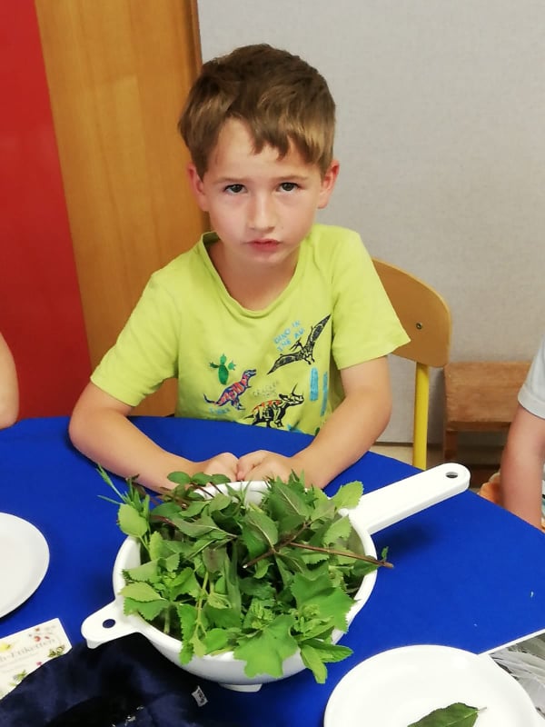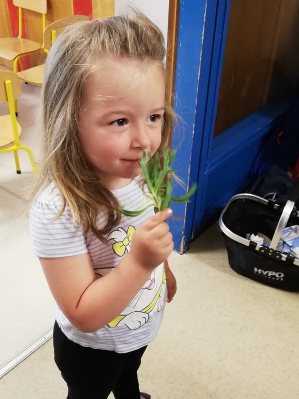 Es wurden, beim Kennenlernen der Kräuter, alle Sinne aktiviert und eingesetzt. Einerseits wurde an den Kräutern gerochen und andererseits durften die Kinder die unterschiedlichen Oberflächen und Blätter „fühlen“. Besonders spannend fanden die Schneckenkinder die bekannte Brennnessel und die Pfefferminze.