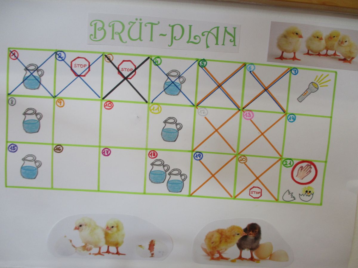 Im April hat eine Gruppe 6 Eier in einem Brutkasten gelegt und genau nach Plan behandelt.