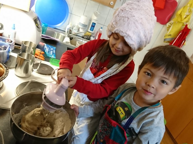 Nachdem bekannt ist, dass industriell hergestelltem Brot meist Konservierungsstoffe zugefügt werden, haben wir begonnen wöchentlich unser eigenes Brot zu backen. Jede Woche können zwei Kinder unsere Backmeister sein. Mit Backmütze und Schürze bekleidet geht es los. Die Kinder erleben hautnah mit, welche Zutaten sich in einem Brot befinden und wie daraus der Teig entsteht. Spannend ist das Beobachten der Hefe und des Sauerteigs, wenn der Teig langsam beginnt aufzugehen. Alle freuen sich, wenn sich der Duft nach frisch gebackenem Brot langsam in unserem Kindergarten ausbreitet. Bei der Nachmittagsjause wird das noch warme Brot dann gleich von Groß und Klein genossen