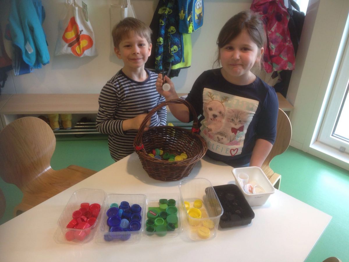 Für ein Gartenprojekt waren wir bereits fleißig am Plastikstöpselsammeln, in allen Größen und Farben, und haben schon eine riesige Auswahl an den tollsten Farben und Größen und Mustern beisammen. Frisch gewaschen und fein säuberlich sortiert kann man damit die tollsten Spiele spielen, Muster legen, umsortieren, turnen und basteln!