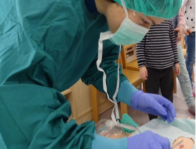 Zum Schluss wurden den Kindern verschiedene Werkzeuge, die man bei einer Operation braucht sowie ein Zugang gezeigt. Die Pädagogin wurde mit Mantel, Gummihandschuhen, Mundschutz und OP-Haube ausgestattet und durfte bei Puppe "Lotta" eine "Operation" durchführen. Gespannt wurde sie dabei von den Kindern beobachtet.