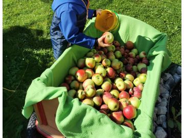 Endlich war es soweit – unsere Äpfel von den Säulenbäumen im Naschgarten konnten geerntet werden. Die Kinder waren beim Pflücken eifrig dabei und die Früchte wurden im Bollerwagen gelagert.