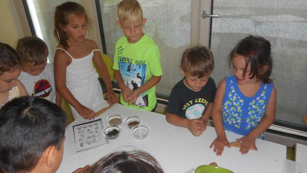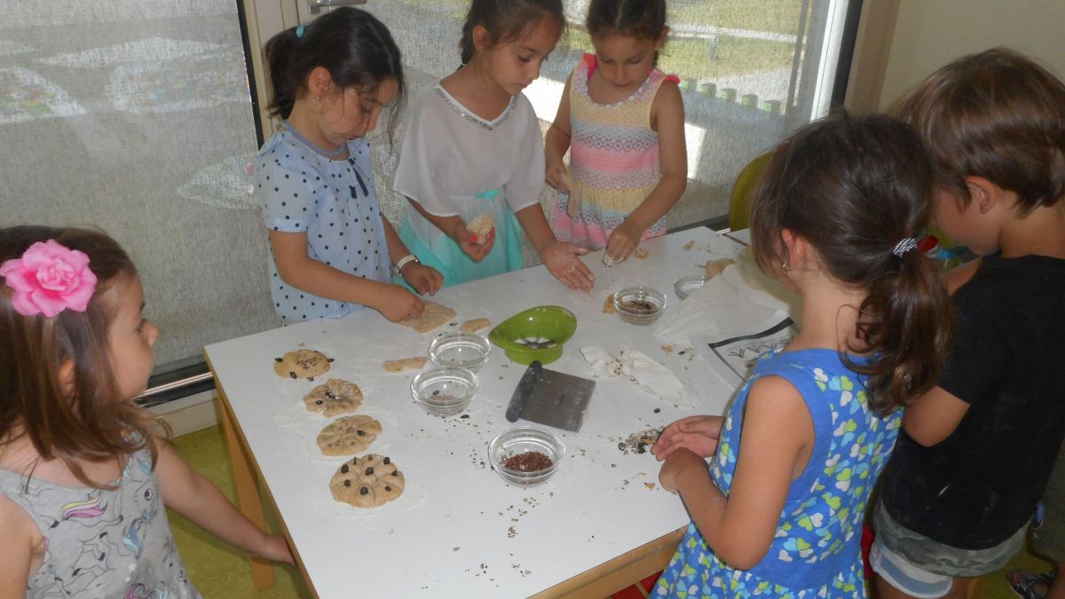In unserem Speiseraum wurde ein Brotbackstube vorbereitet, in der die Kinder Getreide mahlen, bei der Zubereitung des Brotteigs helfen durften und schließlich selber ein Brotstück formen konnten, das in unserer pädagogischen Küche gebacken wurde.