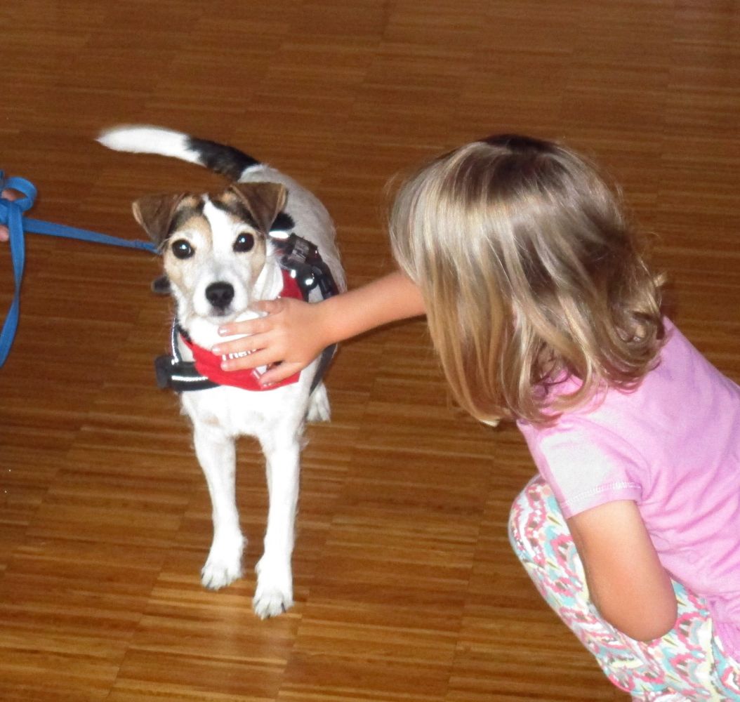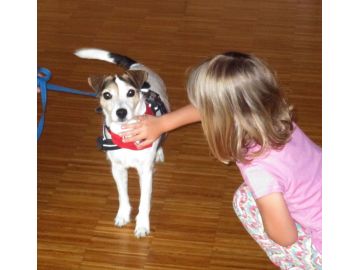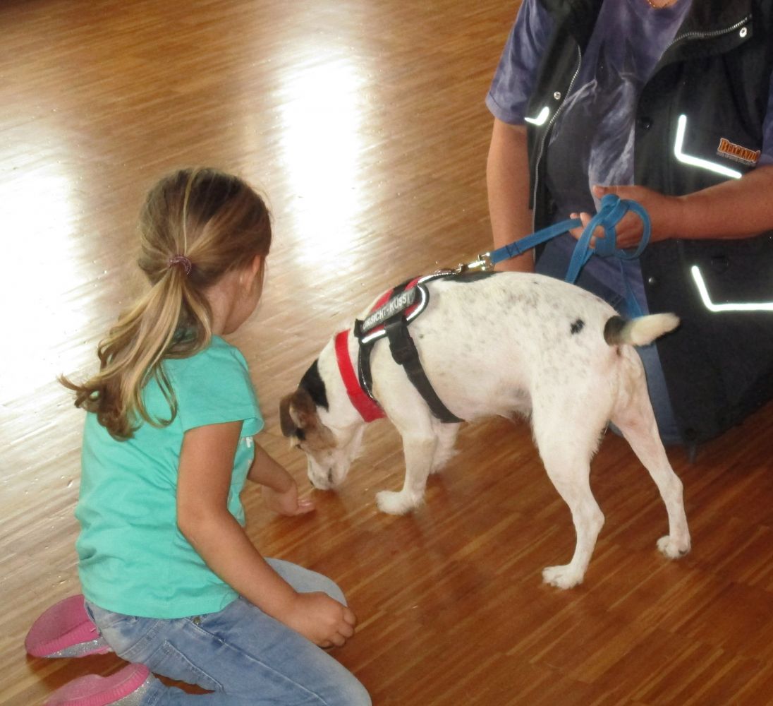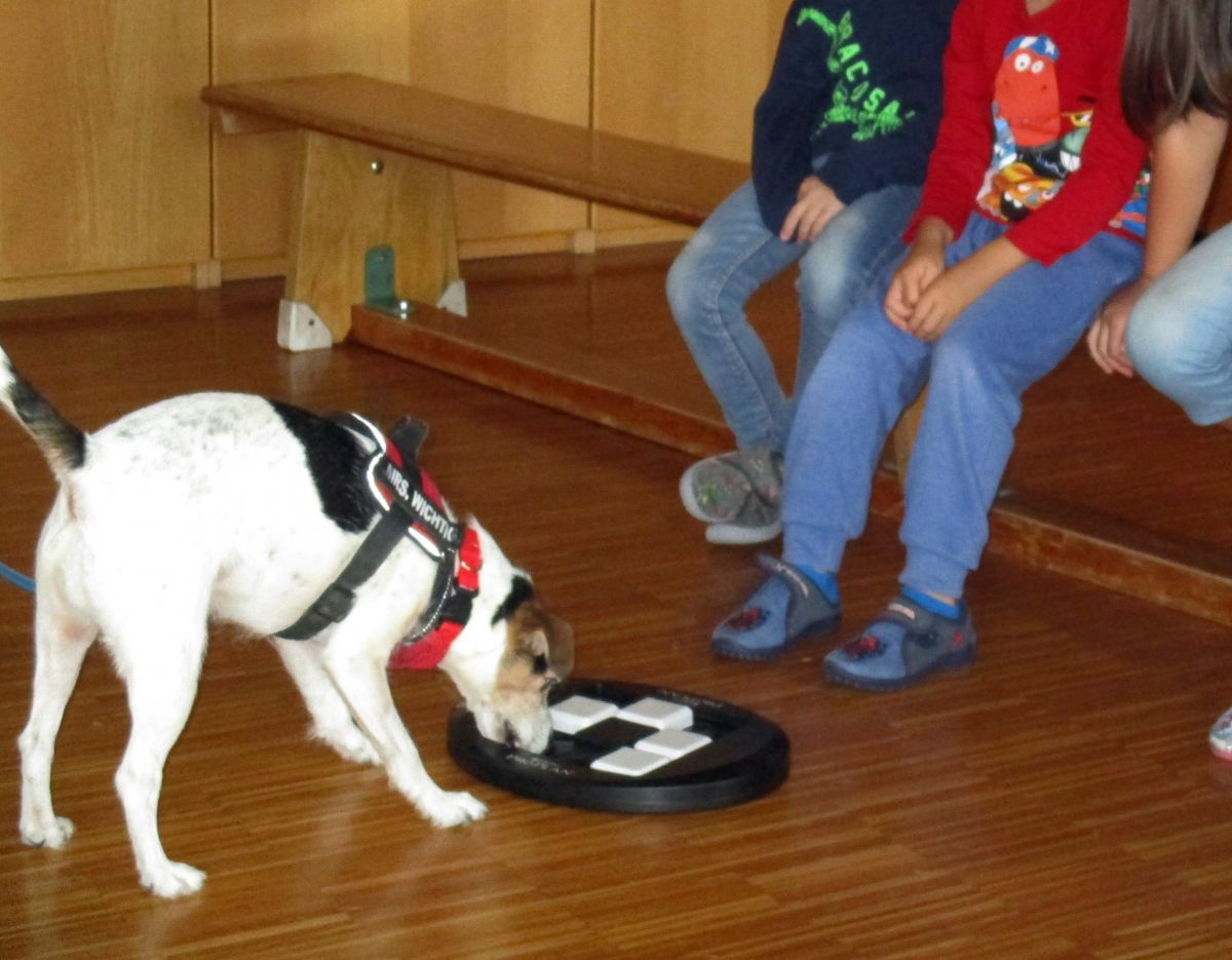 In einem 40minütigen Workshop erfahren wir, wie man über den Besitzer mit einem Hund in Kontakt tritt, dem Hund ein erstes „Beschnuppern“ ermöglicht, wie und wo er gestreichelt werden möchte, welche Dinge für die Hundehaltung benötigt werden und wie man einem Hund ein Leckerli reicht. Die Kinder dürfen den Hund ein kurzes Stück an der Leine führen, und staunend dabei zusehen, wie er mit Schnauze und Pfoten geschickt Blöcke an einem Spielbrett verschiebt, um an die darunter versteckten Leckerlis zu gelangen. Mancher Vierbeiner hat sogar noch ein paar Kunststücke für uns auf Lager …