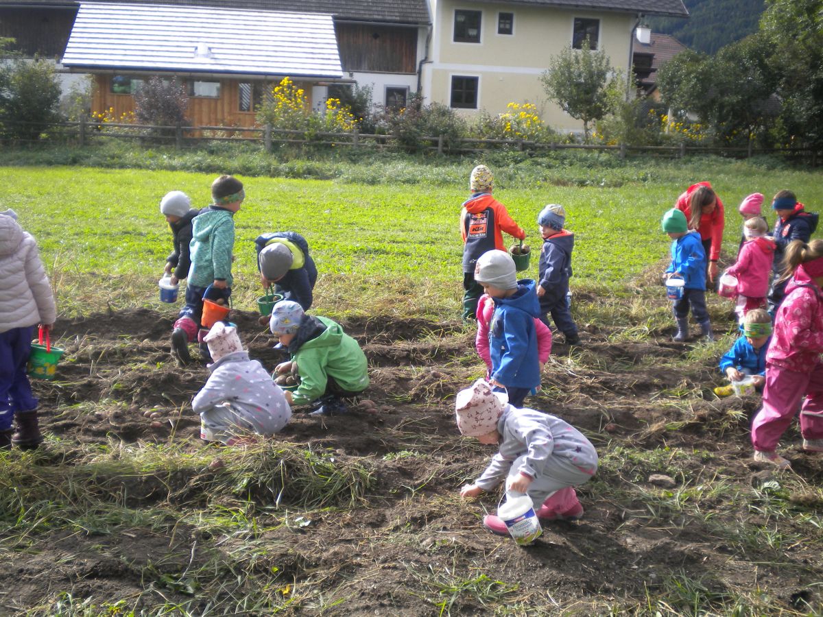 Zum Abschluss durfte sich jedes Kind drei Eachtling aussuchen und diese im Kübel zum Kindergarten tragen. Bei unserem Erntedankfest nehmen wir die Eachtling im Erntedankwagerl mit und werden sie danach im Kindergarten gemeinsam verkochen.