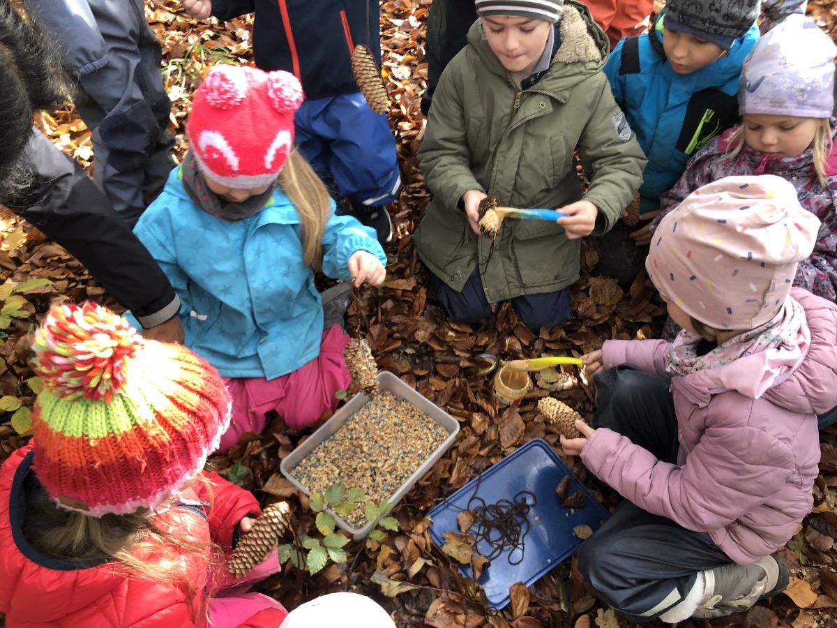 Heute besuchte uns im Kindergarten eine Waldpädagogin. Gemeinsam machten wir uns auf den Weg in den Wald. Dort angekommen erzählte uns die Waldpädagogin eine Geschichte über Vögel. Wir lernten, dass viele Vögel, wenn der Winter kommt, unser Land verlassen. Nur ein paar Vögel bleiben den Winter über bei uns. Es ist schwierig für sie Nahrung zu finden, wenn alles mit Schnee bedeckt ist. So beschlossen wir gemeinsam eine Futterstelle für zu basteln. Aus gesammelten Zapfen, Erdnussmouse und Vogelfutter bastelten wir eine tolle Futterstelle. Die beschmierten Zapfen verteilten wir dann im Wald. Jetzt hoffen wir, dass alle Vögel über unsere tollen Futterstellen bescheid wissen.