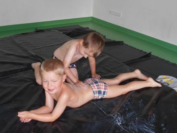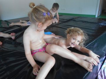 Im warmen Turnsaal werden dicke Matten aufgelegt, mit Teichfolie abgedeckt und dann dürfen sich die Kinder in Badekleidung selber und/oder gegenseitig eincremen, auch die Folie eincremen und mit ein wenig warmen Wasser kann schon "losgeflutscht" werden.