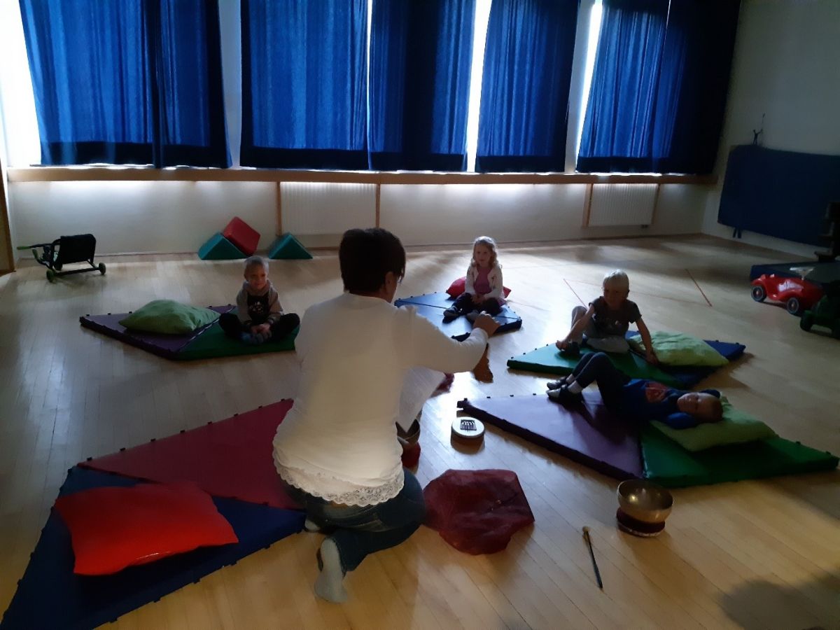 Unsere jahrelange Kollegin Christine Ernst, die seit Februar in Pension ist, kam für zwei Tage zu uns in den Kindergarten, um mit den Kindern Entspannungsübungen mit Klangschalen und verschiedenen Instrumenten durchzuführen. Dafür arrangierte sie eine angenehme Atmosphäre mit Räucherstäbchen, abgedunkeltem Raum und bequemen Kissen. Die Kinder konnten so vom stressigen Kindergartenalltag eine Pause machen und zur Ruhe finden.