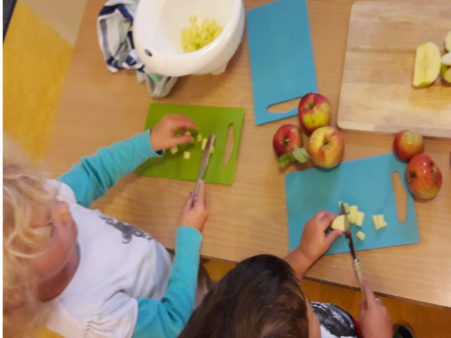 In der Küche wurden die Äpfel geschnitten und danach zu einem Kompott verkocht. Dieses leckere Kompott wurde zur Jause ausgeteilt.