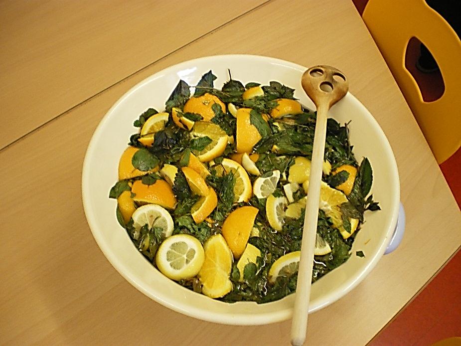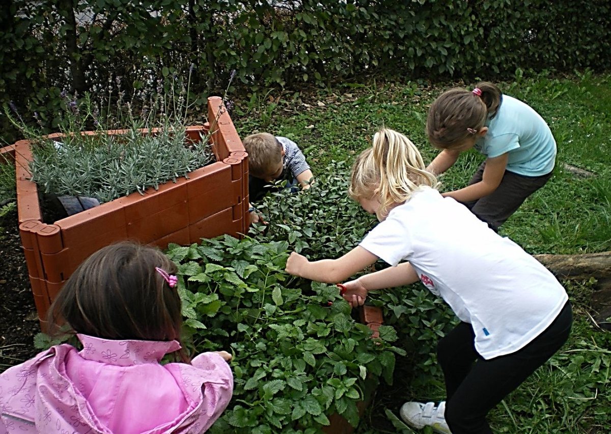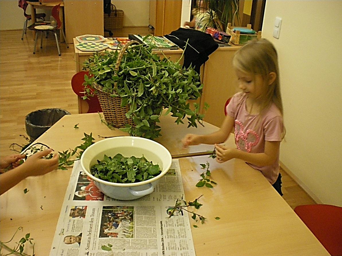 Aus den biologischen Kräutern bereiteten die Kinder selbst einen Zitronenmelissensirup zu. Während von der Kräuterschnecke noch die duftenden Kräuter geerntet wurden, waren die Kinder im Gruppenraum fleißig beim Sortieren, Zupfen und Schneiden der weiteren Zutaten.