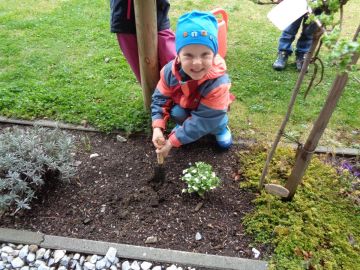 Immer wieder beteiligten sich die Kinder am Erweitern des Gartens. So wurden die vorgezogenen Pflänzchen ausgepflanzt, neue Samen gesät, das Weidenhaus neu bepflanzt und alles gehegt und gepflegt. Einige Kinder brachten sogar Mist von ihrem Hof, um die Pflanzen zu düngen. Es war den Kindern klar, dass auch unser Garten gute Nahrung braucht (so wie wir die Schlaue Kiste). Das Sprühen der Mikroorganismen übernehmen die Kinder auch sehr gerne, da die große Spritzflasche etwas Besonderes darstellt. Es gelingt uns immer mehr die Pflege des Naschgartens in unseren pädagogischen Alltag einfließen zu lassen und somit eine Fülle von Lernprozessen anzuregen.