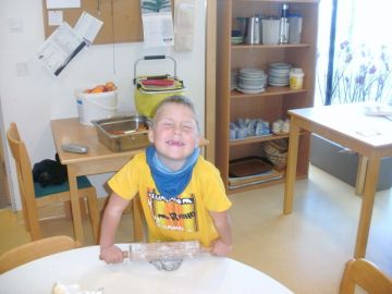 Um unsere Jause abwechslungsreicher zu gestalten, überlegen wir uns regelmäßig etwas Besonderes. Dieses Mal gab es eine selbst gemachte Jause. Keine Frage, dass die frische Bauernmilch, von einen Kindergartenkind mitgebracht, nicht lange da war. Die Kinder waren richtig stolz, dass sie alles ganz alleine zubereitet haben. Durch diese Tätigkeit sind sie wieder ein Stück selbstständiger geworden und haben mit viel Begeisterung den Umgang mit einigen Küchengeräten gelernt.