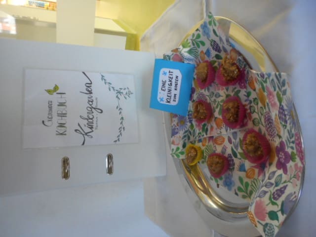 Vor der Eingangstüre steht an den Kochtagen ein nett gedecktes Tischchen mit Kostproben in Papierschälchen zum Mitnehmen und dort wartet auch das selbstgestaltete Kochbuch mit den Rezepten drin.