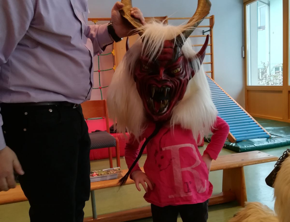Pünktlich zum 5. Dezember durfte auch der Krampus zu uns ins Haus hinein. Es sind bekannte Gesichter der Radecker Pass aus Bergheim. Die zwei Kinder Fabian & Patrizia waren selbst vor ein paar Jahren noch in unserem Kindergarten. Als Unterstützung und Erklärer haben sie ihren Vater mitgebracht, der den Kindern alle Fragen beantwortet hat.