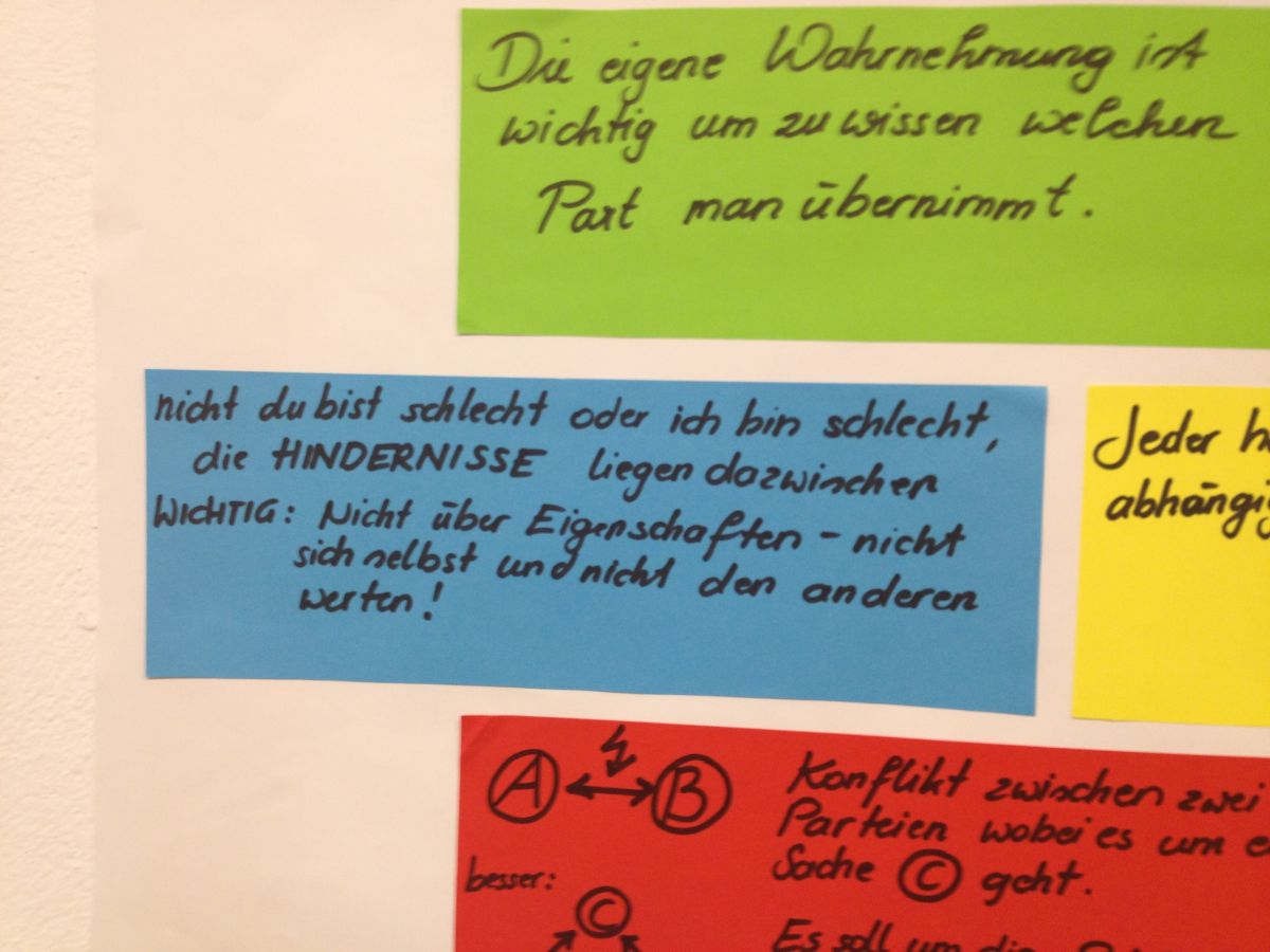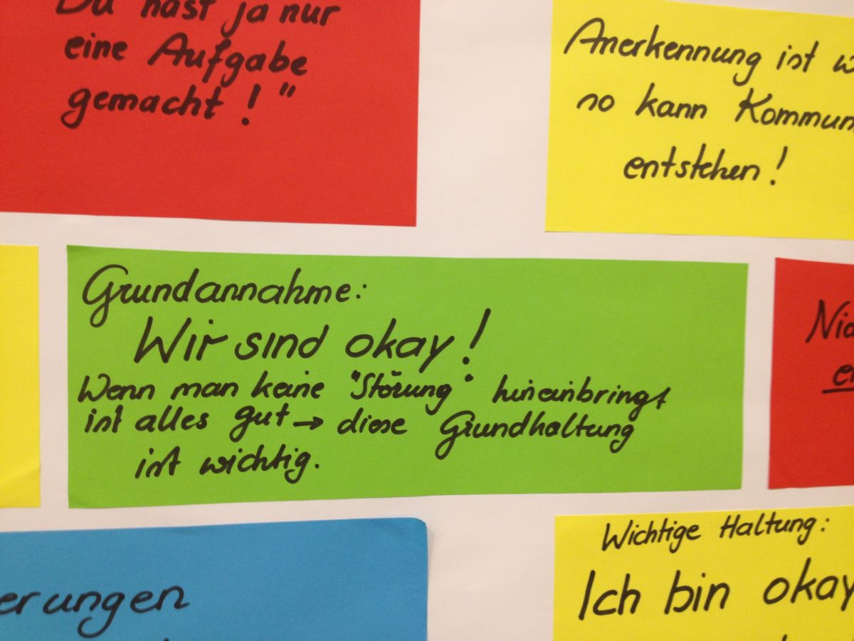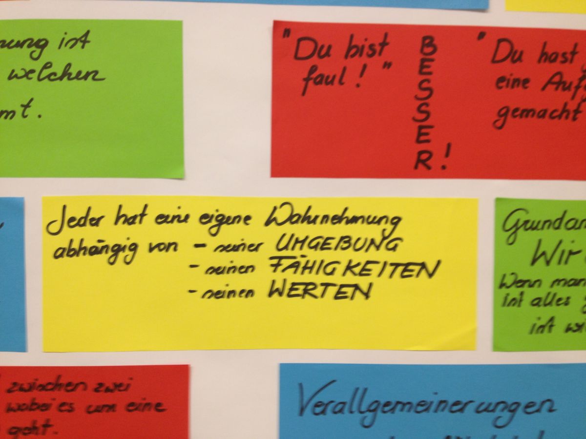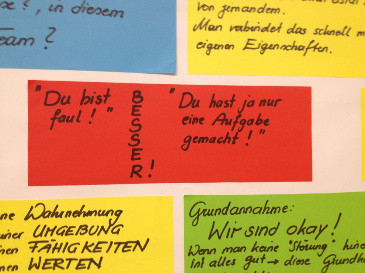Viele sind gekommen, angereist aus den Gauen und der Stadt, um sich mit Frau Mag. Gerda Gratzer auf dieses Thema einzulassen. Mit Mut und Humor konnten die PädagogInnen in den vielen Übungen, die angeboten wurden, Wissen zu Haltung und Wahrnehmung und Kommunikationsformen erleben, reflektieren und mitnehmen. Im Kindergarten Maishofen steht alles wunderbar auf Kärtchen zusammengefasst für die Teammitglieder, die beim Treffen nicht dabei sein konnten. Der gute Geist ist also auch mit heimgereist. Dank an Magdalena Böhm, die ihren Transport allen zur freien Verfügung stellt, vielen Dank! (im Anhang)