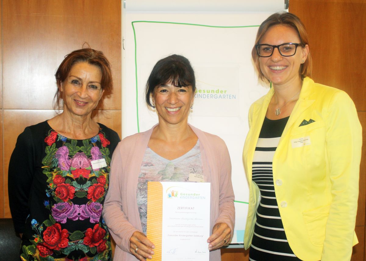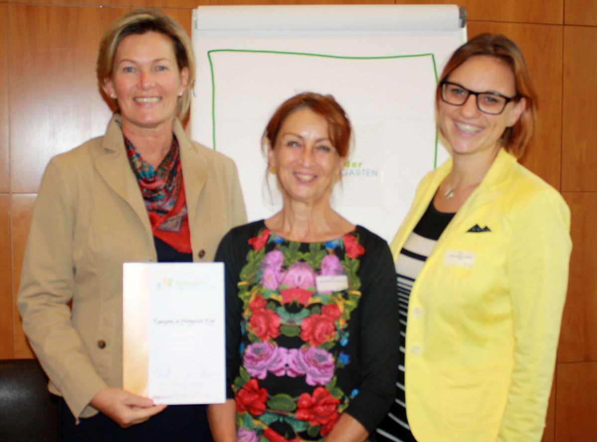 Der 2. Höhepunkt war das Vernetzen am Beginn der Veranstaltung und in der Pause - auch wenn es manchen noch zu kurz war. Den 3. und letzten Höhepunkt dieses Nachmittags bildete die feierliche Überreichung der Zertifikatsverlängerungen an die anwesenden VertreterInnen der Kindergärten Herrnau, Kuchl und Lamprechtshausen! Stuhlfelden, Schwarzach Siedlung und Mauterndorf waren entschuldigt. Gratulation an alle!