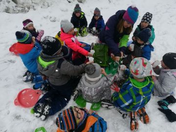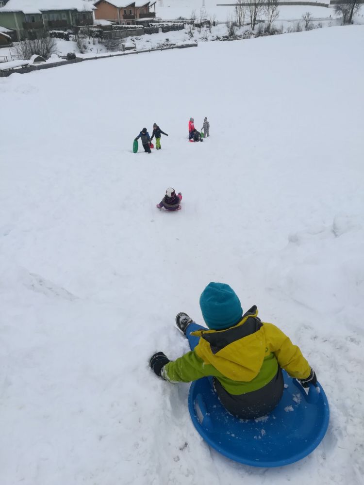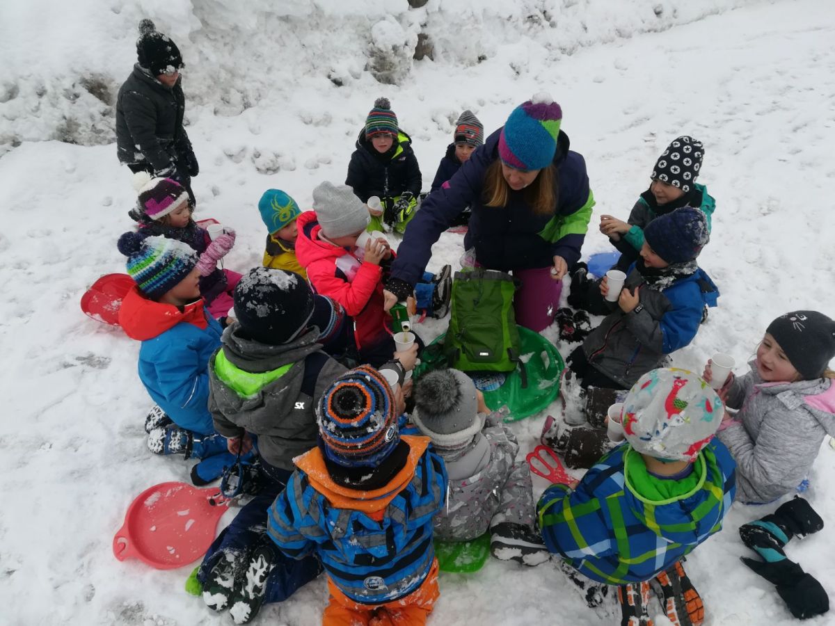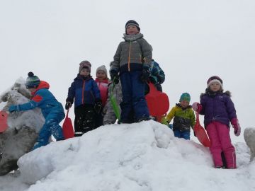 Jeden Donnerstag haben wir unseren Naturtag. Im Winter gehen wir Teller rutschen bzw. Bob und Schlitten fahren.