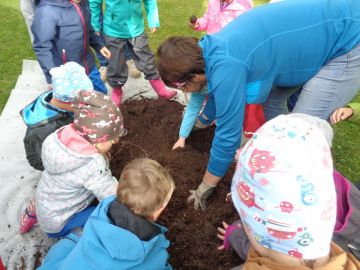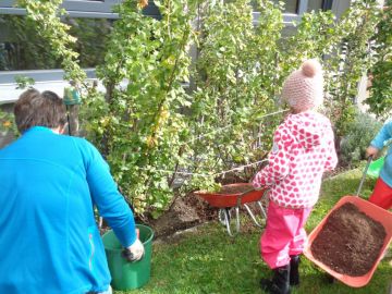 Endlich war es soweit: unsere Kartoffeln aus dem Sack konnten geerntet werden. Mit großer Spannung und mit der Hilfe unserer Gärtnerin wurde der Sack entleert. Voller Eifer wühlten die Kinder in der Erde und legten die Kartoffeln frei. Jeder, der eine Knolle fand, freute sich riesig. Obwohl wir Pädagoginnen uns mehr Ertrag erwartet hätten, waren die Kinder völlig zufrieden mit der Anzahl der Kartoffeln. Für sie war es faszinierend, wie sie sich vermehrt hatten. Besonders gefiel ihnen auch die violette Farbe unserer Kartoffeln. In den darauffolgenden Tagen führten wir einige Aktivitäten zum Thema „Kartoffel“ durch. Beim Erntedankfest stand natürlich der Erdapfel im Mittelpunkt und zur Jause gab es Kartoffelwedges mit Kräuterdipp aus unserem Naschgarten. Auch eine Kartoffelsuppe konnten wir in nächster Zeit noch zubereiten. Trotz der ungewöhnlichen Farbe schmeckten unsere Kartoffelspeisen fast allen Kindern.