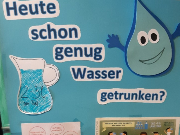 In jeden Gruppenraum gibt es jetzt einen fixen Wasserkrug, der als Erinnerung dienen soll, sodass wir Pädagoginnen auch genug trinken. Wenn uns die Kinder dabei sehen, werden sie selbst erinnert aus ihren Wasserflaschen zu trinken. Zusätzlich zu den Wasserflaschen, gibt es auch eine Trinkstation, wo sich die Kinder beispielsweise Zitronenwasser in den Becher schenken können. Im Eingangsbereich haben wir ein großes Plakat befestigt, damit auch die Eltern für das Thema sensibilisiert werden und auch zu Hause weiterführen.