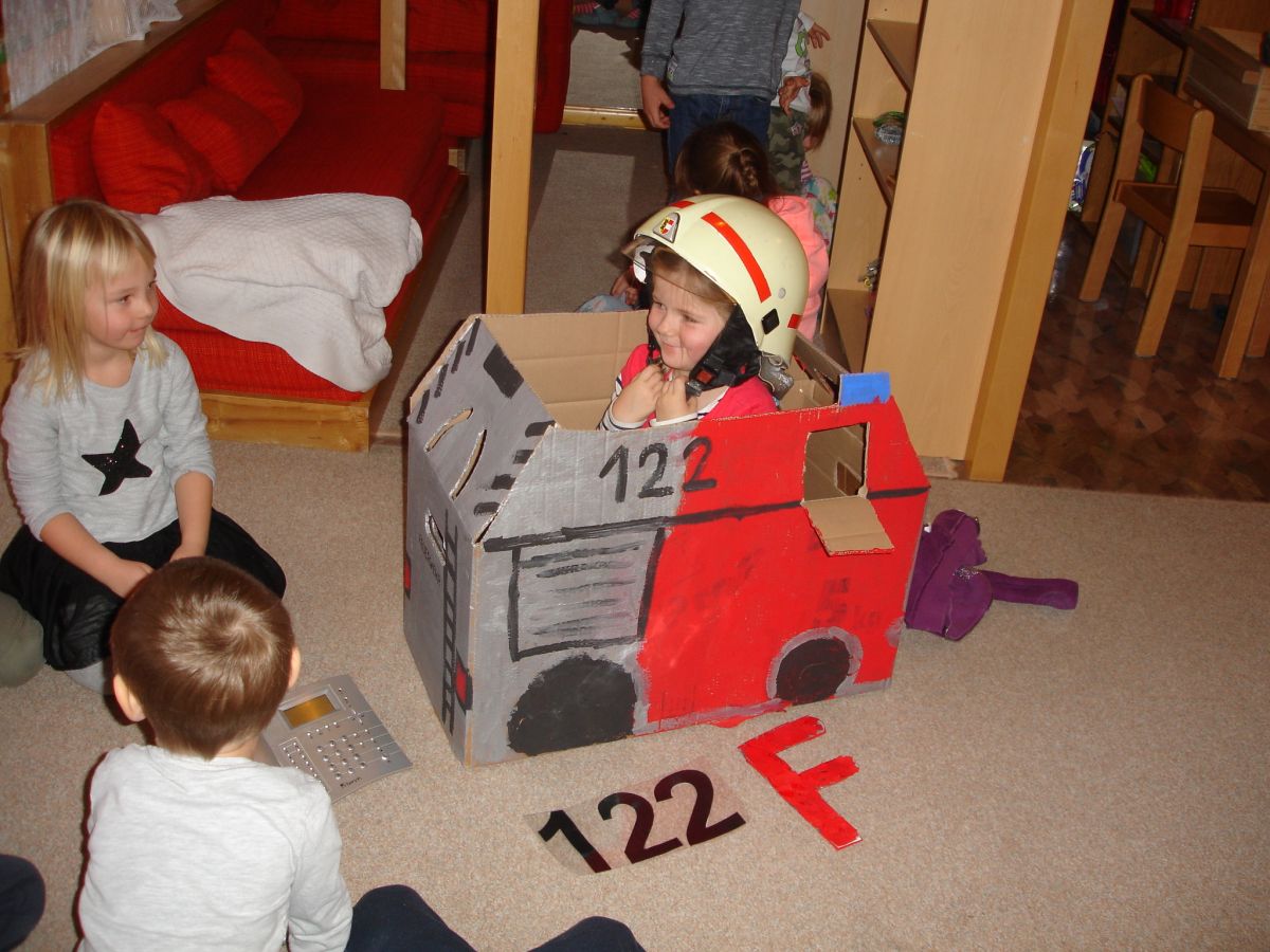 Gemeinsam mit den Pädagoginnen erbauten die Kinder ein Feuerwehrfahrzeug aus Karton. Danach wurden Feuerwehrsituationen durchgespielt und Notrufe erprobt. Infolgedessen wurde der Kindergarten nach Brandschutzmaterial durchsucht. Es wurden Feuerlöscher, Brandschutzdecken, Fluchtwege und Feuermelder gefunden. Als Abschluss des Projektes besuchten die Kinder voller Eifer und Motivation die Feuerwehr Wagrain. Sie stellten Fragen an den Feuerwehrhauptmann, spielten Situationen durch und wurden am Ende mit den Feuerwehrfahrzeugen zurück in den Kindergarten gebracht.