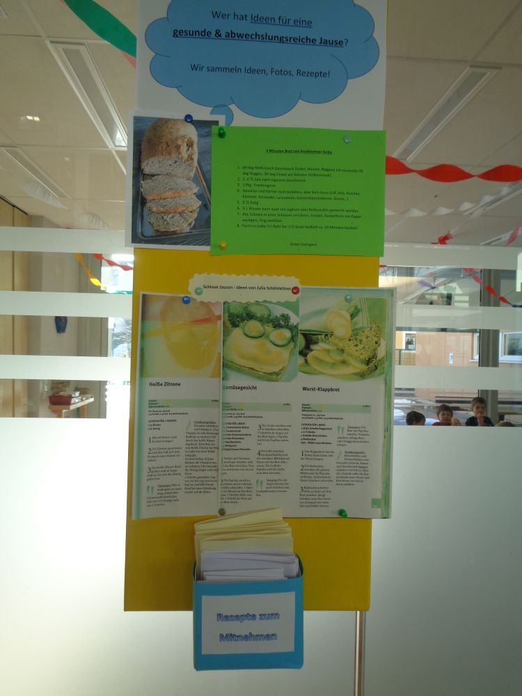 Seit Jänner haben wir eine Anschlagtafel, an der Eltern ihre Ideen für eine schlaue Jause austauschen können. Es werden Bilder und Rezepte mitgebracht. Die Rezepte können auch mit nach Hause genommen werden. Es wird von den Eltern sehr gut angenommen, sowohl das Bringen der Rezepte als auch das Mitnehmen der Ideen.