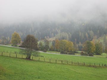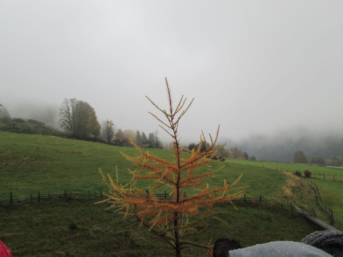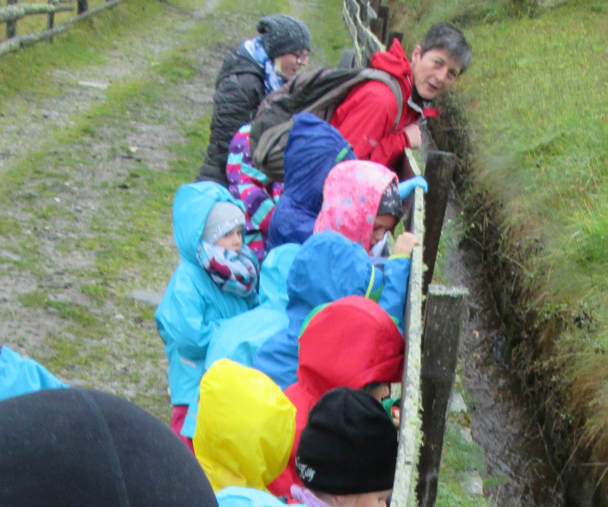 Im Rahmen des aktuellen Jahresprojektes, in dem es darum geht, was sich in Natur und Umwelt jahreszeitenspezifisch verändert, erkundeten wir (Kinder und Kigateam des KG Lessach) in Begleitung der Igel-Handpuppe "Fexi" die nähere Umgebung des Kindergartens nach herbstlichen Besonderheiten. Angeleitet wurden wir dabei von Fr. Bettina van der Vaart, einer als so genannte UNESCO-Biosphären-Fex ausgebildete Natur- und Landschaftsvermittlerin. Bei nebligem Nieselregen-Wetter ließen wir uns dank entsprechender Kleidung nicht davon abbringen, den Herbst auf sinnliche Art zu erleben. So konnten wir u.a. die fast golden leuchtenden Nadeln der Lärche im Vergleich zu den noch satt grünen Fichtennadeln sehen. Letzte Schopftintlinge trotzten den schon kühlen Tagen und Nächten und stellten so eine Nahrungsquelle für Schnecken und Würmer dar. In einem kleinen Graben, der sich entlang des Weges zog, konnten wir das langsam dahin fließende Wasser plätschern hören. Und ob wir wollten oder nicht, wir konnten die kühle, feuchte Luft auf unserer unbedeckten Haut im Gesicht spüren und die feuchte Erde und durch den Regen aufgeweichte Kuhfladen riechen. Fr. van der Vaart zeigte uns auch Abbildungen von Vögeln zu gefundenen Vogelfedern und wir konnten über ihren Ting-Hörstift sogar die passenden Vogelstimmen hören. Zu den Besonderheiten an diesem Vormittag gehörten auch das Hören der Schmatz- und Schnalzgeräusche eines Igels und das Betrachten eines Holunderstrauches, der weiße Holunderblüten und schwarze Holunderbeeren zugleich trug.Müde, hungrig und um viele Sinneseindrücke reicher, kamen wir mit "Fexi" und den gesammelten Schätzen zum Kindergarten zurück.