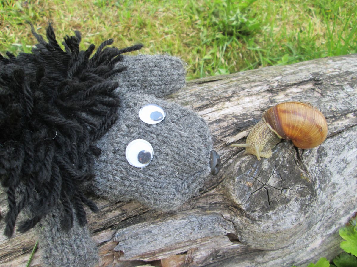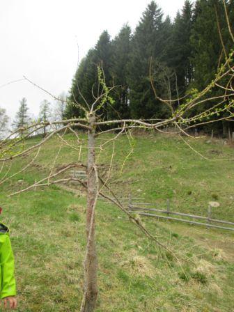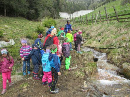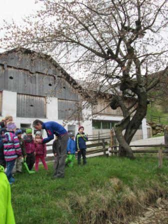 Da auf den Berggipfeln noch Schnee lag, den man vom Tal aus sehen konnte und der Himmel bewölkt war, machten wir uns, gegen Nässe und Kälte geschützt angezogen, auf den Weg. Als erstes stellten wir fest, dass in den kleinen Teich, der den Winter über zugefroren gewesen war, nun wieder durch einen Schlauch Wasser floss. Dadurch wurde die Teich-Erde aufgewirbelt, sodass das Wasser ganz braun gefärbt war. Die geschmolzene Eisdecke hatte die Sicht auf den kleinen Graben entlang unseres Wanderweges freigegeben und so konnten wir diesen nicht nur plätschern hören, sondern auch fließen sehen. Die Äste des wilden Vogelkirschenbaumes, der gleich neben dem Teich stand, waren über und über voll mit kleinen weißen Blüten, die vor allem Bienen und Hummeln reichlich Nahrung bieten konnten. Zwischen dem ersten zarten Grün des frisch gewachsenen Grases leuchteten weiß-rosa farbene Gänseblümchen und gelber Löwenzahn hervor und am Wegrand entdeckten wir gelb blühende Huflattiche und braune Schachtelhalm-Stängel. An Nicht-Frucht-tragenden Laubbäumen, wie der Grauerle, zeigten sich unzählige kleine, zartgrüne Blätter, am Rosskastanienbaum hingegen hatten sich die noch immer klebrigen Knospen zwar leicht gelockert, ohne aber die spätere Blütenpracht preis zu geben. Obwohl die kleine Lärche, wie wir bereits bei der Winterwanderung gesehen haben, keinen Baumwipfel mehr hatte, sprossen auch aus ihren Zweigen feine hellgrüne Nadeln hervor. Als wir uns wieder dem Kindergarten näherten, wurde das Motorgeräusch eines Traktors immer lauter hörbar: Tobias Papa war gerade dabei, den umgepflügten Acker zu eggen. Auf die Frage, warum er die Erdfläche, die er offensichtlich bereits auf und ab durchfahren hatte, nun noch hin und her durchfuhr, erklärte er uns, dass dies notwendig sei, damit das Regenwasser die gelockerte Erde nicht nach unten wegschwemmen konnte. Er hat uns dann noch verraten, dass er auf diesem Acker später Kartoffeln pflanzen wird und wir im Herbst dann wieder beim Einsammeln, dem „Eachtlingklauben“ wie wir sagen, helfen dürfen. Etwas müde aber gut gelaunt kamen wir wieder im Kindergarten an, wo wir die gesammelten Schätze in die Schatztruhe legten bzw. in kleine, mit frischem Wasser gefüllte Vasen steckten. So würden wir sie während der nächsten Tage und Wochen im wahrsten Sinn des Wortes noch genauer unter die Lupe nehmen können. Und wie ist es Fexi ergangen? Er hat sich besonders darüber gefreut, dass auch für ihn jetzt wieder Fressbares in Form von Würmern, Schnecken und ersten Käfern zu finden war!