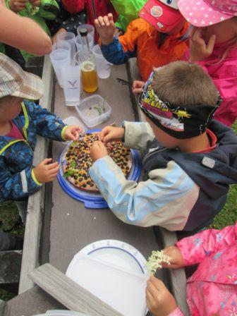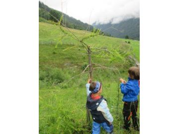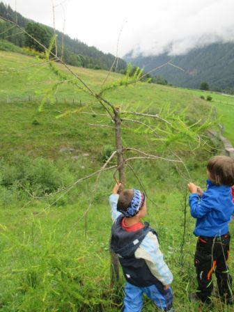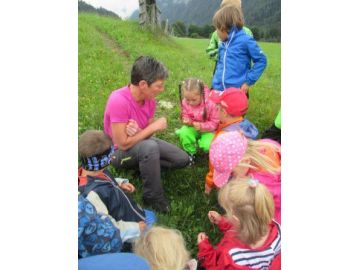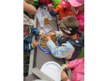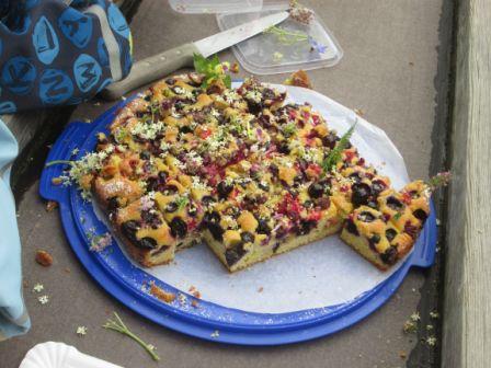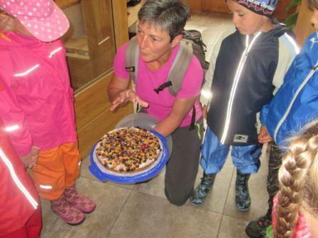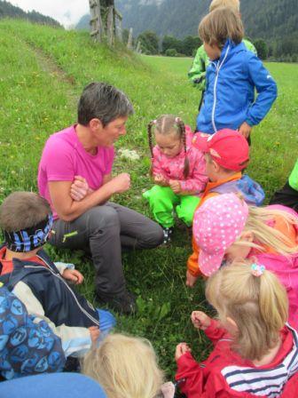 Wie geplant haben wir (die Kinder und das KG-Team vom KG Lessach) uns zusammen mit Igel Fexi ein letztes Mal auf den Weg gemacht, um zusammen mit Fr. Bettina van der Vaart (einer als UNESCO-Biosphärenpark-Fex ausgebildeten Natur- und Landschaftsvermittlerin) auch den Sommer zu spüren, zu riechen, zu hören, zu schmecken und zu sehen. Zu unser aller Überraschung hatte Fr. van der Vaart diesmal einen selbst gebackenen Kuchen mit schwarzen und roten Johannisbeeren und einen ebenfalls selbst gemachten Holundersaft zur Verkostung mitgebracht. Bevor wir uns gemeinsam auf den Weg machten, hat uns Fr. van der Vaart dazu eingeladen, während des Gehens nach essbaren Blüten von Blumen, Sträuchern und/oder Bäumen Ausschau zu halten und diese als schmackhafte und duftende Zierde für den Kuchen zu sammeln. So stellten wir beeindruckt fest, welche Pflanzenvielfalt die Natur ihren Bewohnern bzw. uns zu bieten vermochte: Da waren die verschieden aussehenden und unterschiedlich duftenden Blüten in ihren prächtigen Blütenfarben, angefangen beim roten und weißen Wiesenklee, dem gelben Hornklee, die Blüten des weißen und die Beeren des roten Holunders, die bourdeau-roten Josta-Beeren und die zum Teil bereits vollreifen schwarzen Vogelkirschen mit ihrem saftigen, blutroten Fruchtfleisch und der schwarz aussehenden Fruchthülle. Aber – auch wenn das Blumenrabatt vor dem Nachbarhaus in bunten Farben erstrahlte und die Kapuzinerkresseblüten zum Schmaus einluden, war hier Pflücken verboten! Gekostet werden konnten hingegen die jungen Innenblätter des „BreitwegErichs“, über den und seine beiden Brüder den „Mittleren WegErich“ und den „SpitzwegErich“ Fr. van der Vaart kurze Geschichten zu erzählen wusste.