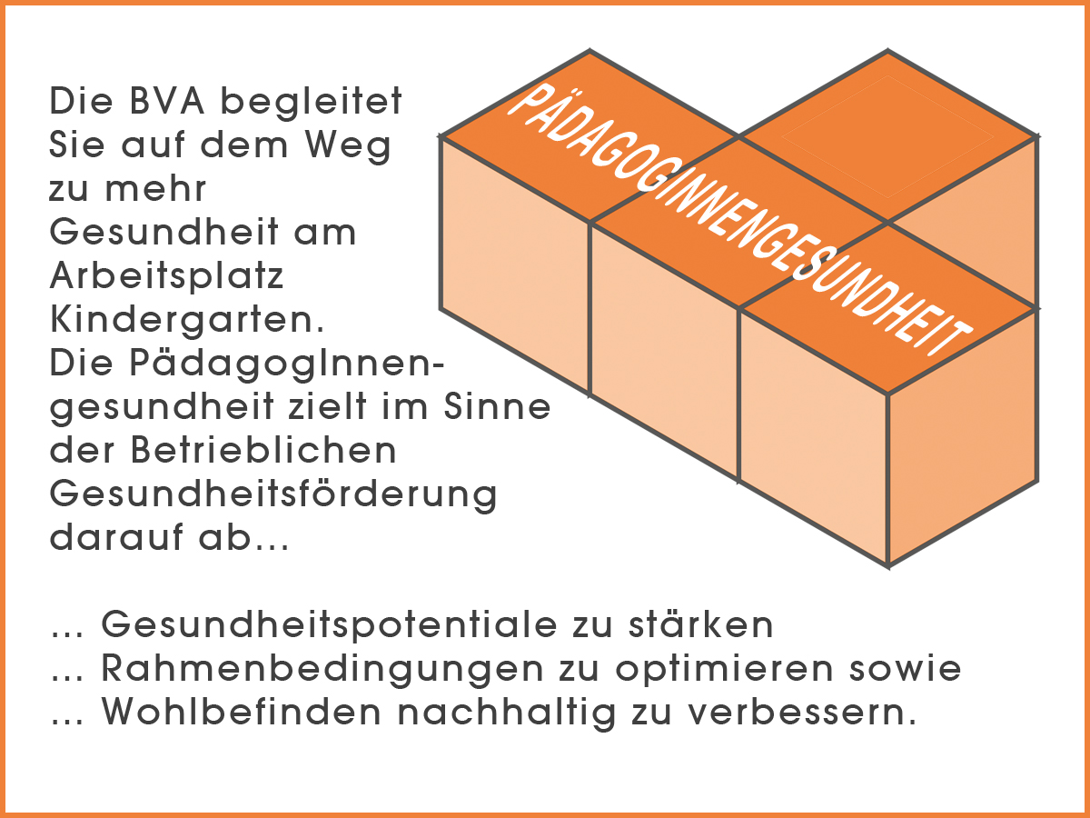 - Kostenübernahme von Vorträgen und Workshops in den Themenbereichen Bewegung, Ernährung, Tabakentwöhnung, Kommunikationsverbesserung und Stimmhygiene sowie Seelische Gesundheit durch ExpertInnen der BVA vor Ort im Kindergarten