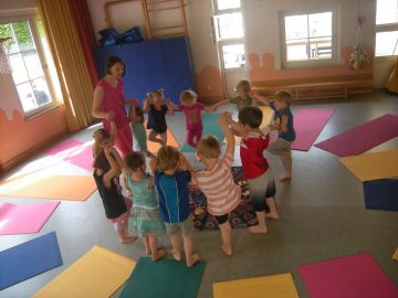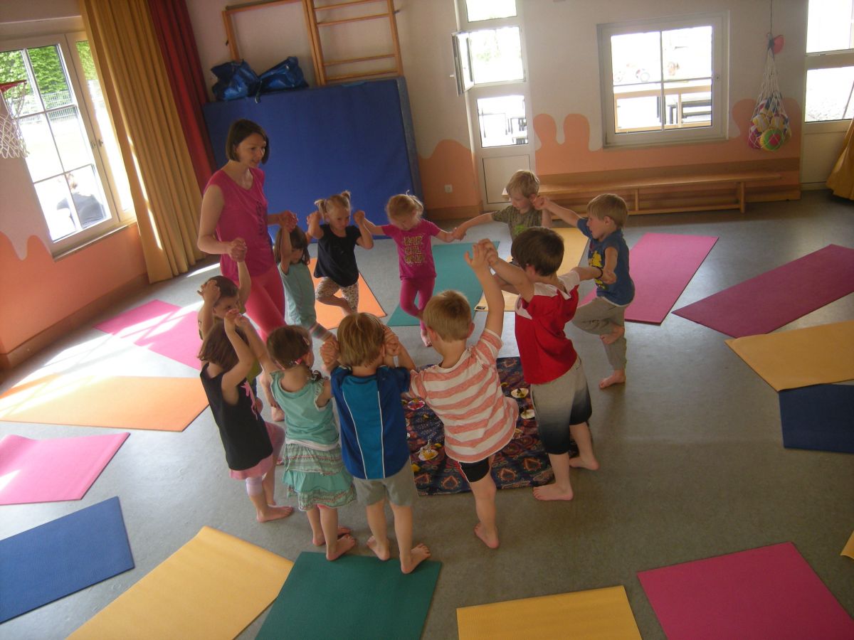 Am Ende des letzten Kindergartenjahres  wurde bei uns im Haus Kinderyoga angeboten. Eine Mama eines unserer Kindergartenkinder im Gemeindekindergarten St. Gilgen ist ausgebildete Yogalehrerin und hat an vier Vormittagen die Yogaeinheiten in Altersgruppen gestaltet.