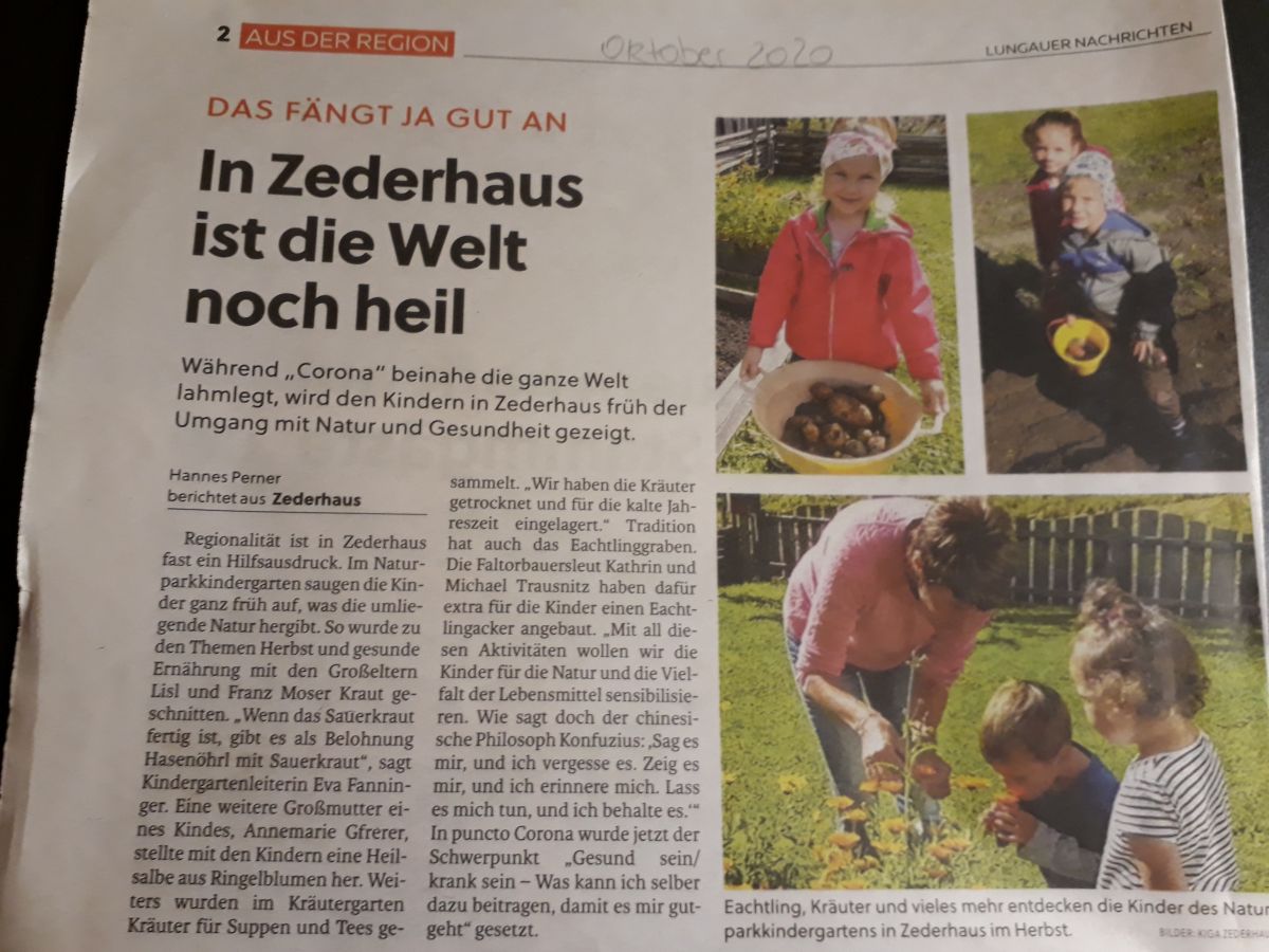 Im Kindergarten Zederhaus wird trotz, oder besser gesagt wegen, der herausfordernden Zeit an gesundheitsförderlichen Themen gearbeitet. Darüber berichteten die Lungauer Nachrichten im Oktober. Besonders wertvoll in dieser Zeit war und ist die Zusammenarbeit und die Unterstützung der Eltern und Familienangehörigen. Die Umsetzung der einzelnen Maßnahmen gelingt auch deswegen so gut, weil sich viele Erwachsene mit Ihren Talenten im Kindergarten einbringen! Vielen Dank für den tollen Bericht!