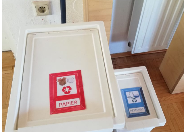 Um die Nachhaltigkeit und das Verständnis dieses wichtigen Themas aufrecht zu erhalten, sortieren wir im Kreis immer wieder unseren Müll. Dazu leeren wir die Mülleimer aus den einzelnen Räumen (Atelier, Rollenspielbereich usw.) aus und werfen ihn in die richtigen Mülleimer. Teilweise müssen wir dazu Handschuhe anziehen, da der Müll nicht immer so sauber ist (vor allem die Taschentücher), dass man ihn angreifen kann ohne krank zu werden.