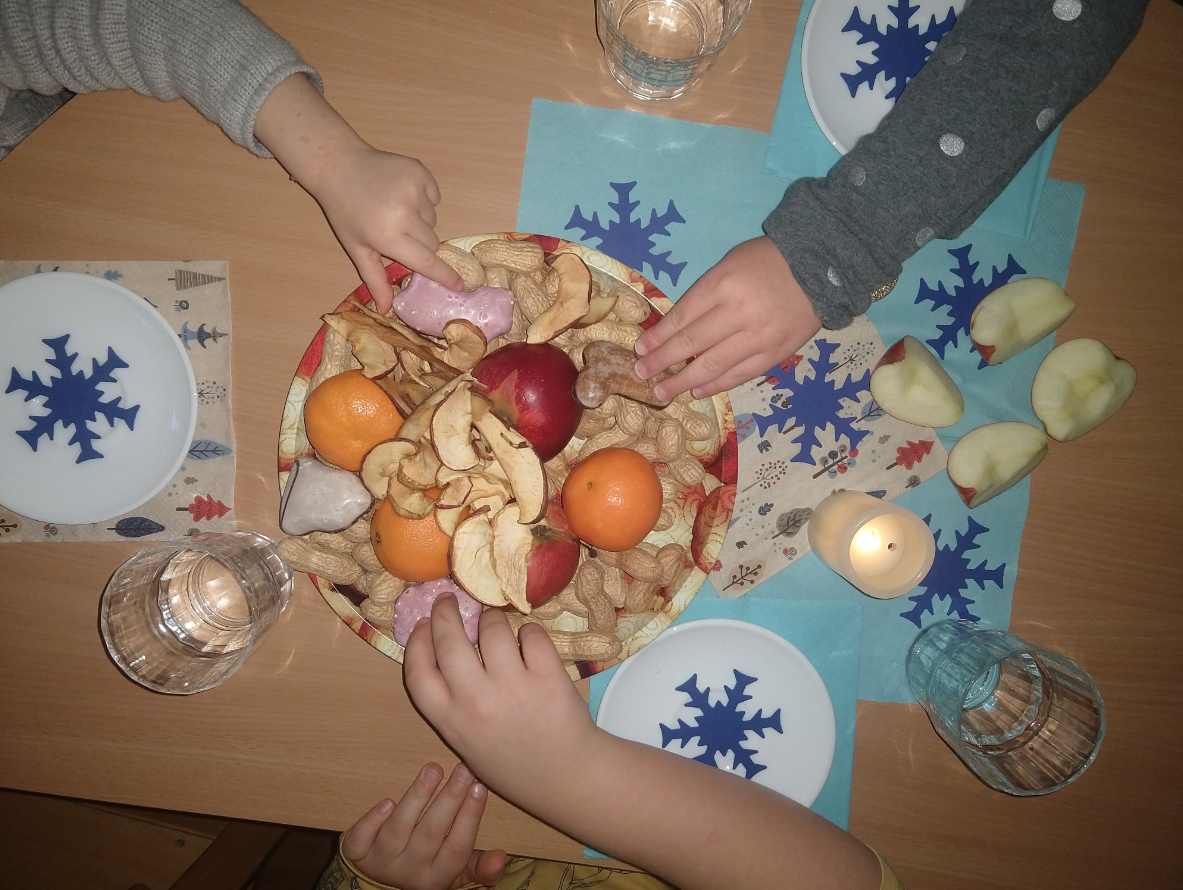Unsere gesunde Nikolausjause mit von den Kindern gedörrtem Obstspalten.