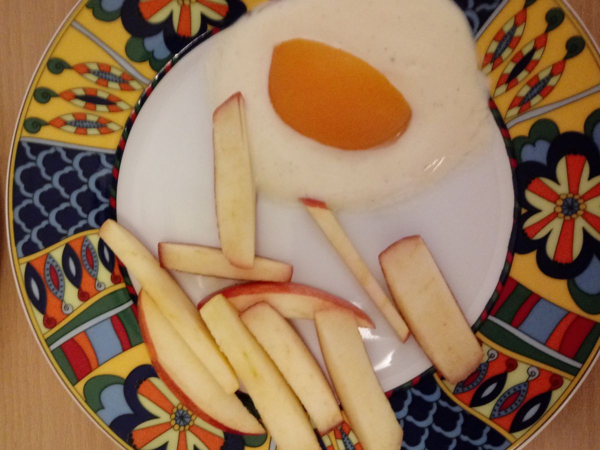 Das Spiegelei besteht aus Vanillejogurt (Eiweiß) und Pfirsichhälften (Dotter).