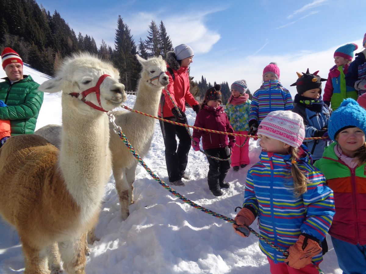Die Kinder der Bärengruppe durften die Alpakas in Wagrain besuchen. Die Gruppe hatte fünf Wochen lang das Projekt „Vom Alpaka zur Wolle“. Zum krönenden Abschluss wurde das Kistzsteingut in Wagrain besucht. Auf diesem Hof befinden sich 24 Alpakas. Die Kinder waren sehr begeistert von den 24 Alpakas am Hof: eifrig erzählte sie, was sie schon alles über die Alpakas wussten. Zudem erfuhren die Kinder viele neue Dinge über die Tiere, zum Beispiel konnten sie die Unterschiede zwischen Schafwolle und Alpakawolle erspüren und die Kinder durften die Alpakas sogar selbst an der Leine zu einem Winterspaziergang ausführen.