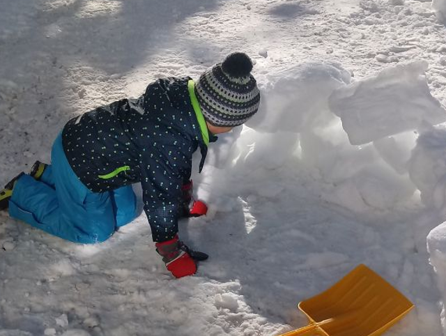 Heute ist ein perfekter, sonniger Tag um eine Schneeburg zu bauen. Alle Kinder helfen mit. Mit Schaufeln und viele Helfern machen sich die Kinder auf den Weg und holen riesengroße Schneebrocken. Diese Schneebrocken werden aufeinander gestappelt. So entsteht eine große Ritterburg aus Schnee.