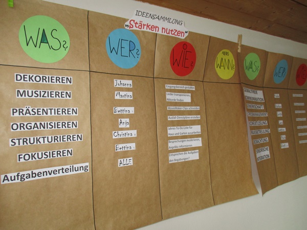 In einem anspruchsvollen und meist ausschließlich auf die Kinder fokussierten Alltag, erleben wir die gemeinsamen Abende nicht nur als Bereicherung für unseren „Teamgeist“, sondern auch als persönliche Kraftquellen. MSc Lisa Auteried begleitet uns professionell zu den Themen „Wertschätzende und klare Kommunikation innerhalb des Teams“ und „Kommunikationstypen und häufige auftretende Verhaltensmuster in Stresssituationen“. Unter der Überschrift „Persönliche Stärken entdecken und effektiv für das Team einsetzen“ sammeln wir Ideen und machen diese in Plakatform für alle sichtbar.