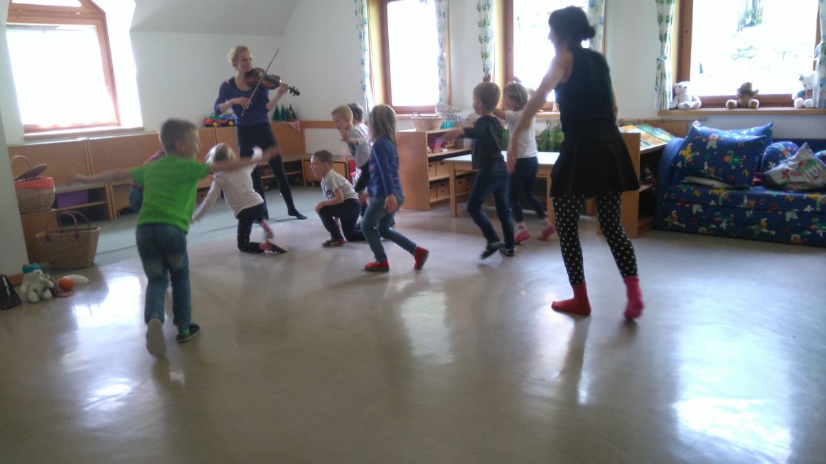 Eine große Herausforderung an unsere Schulanfänger war die Aufgabe von Gudrun: " Immer, wenn ihr die Geige hört, bewegt euch als Tier durch den Raum, bei Musikstopp sollt ihr schlafen. Bei gleichbleibendem Geigenton dürft ihr weder schlafen, noch euch als Tier bewegen, ihr müsst als Baum im Gruppenraum stehen."