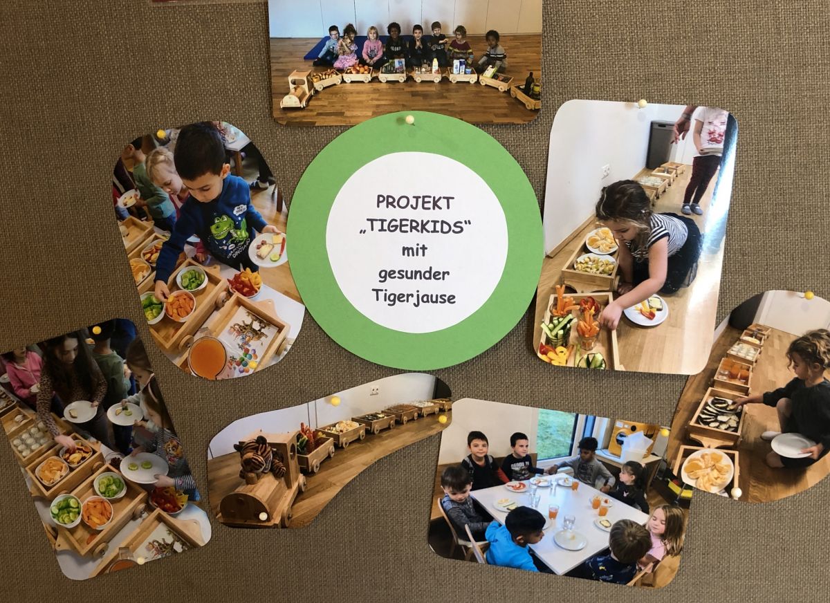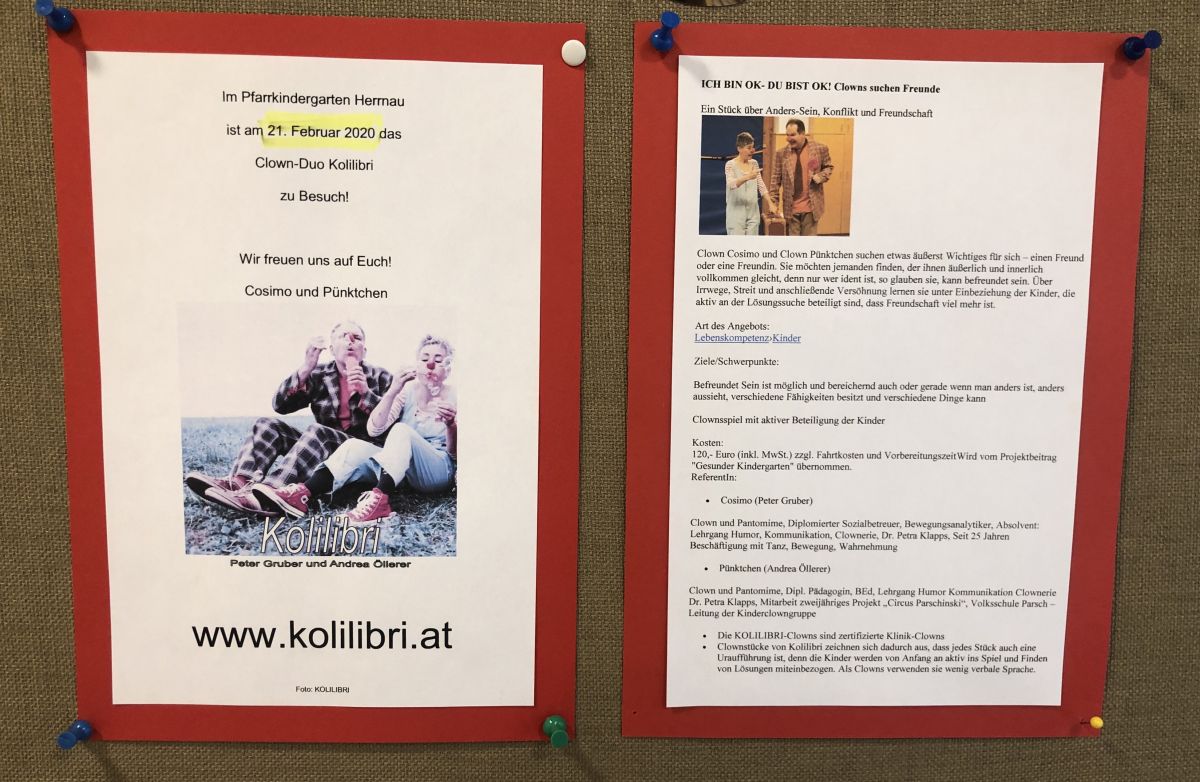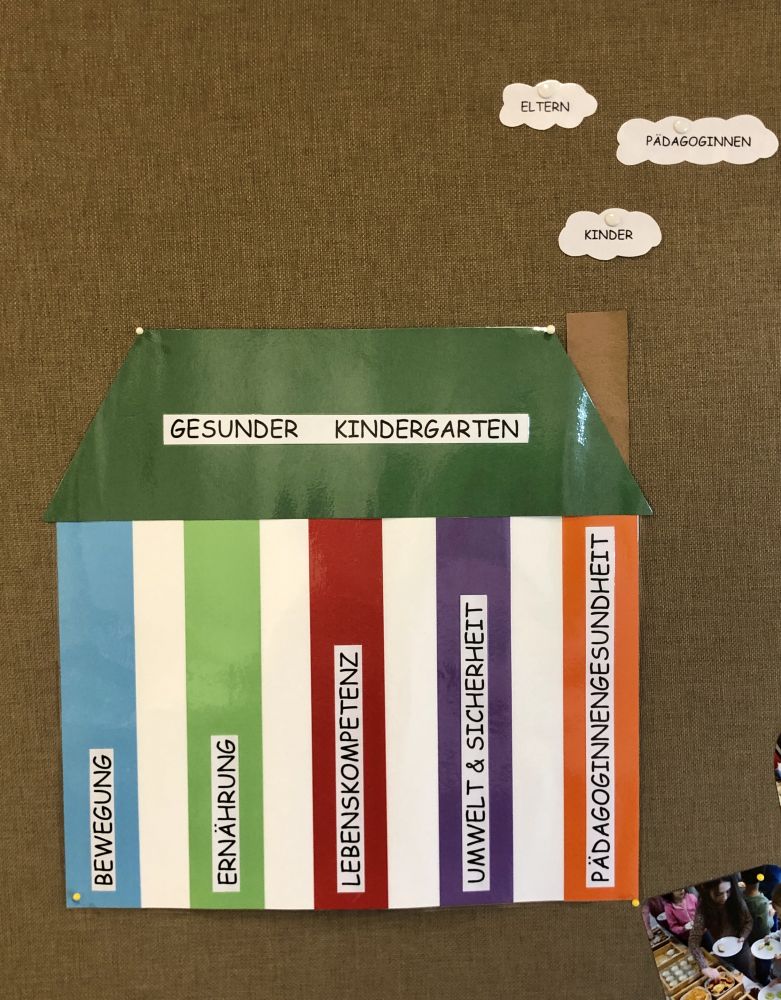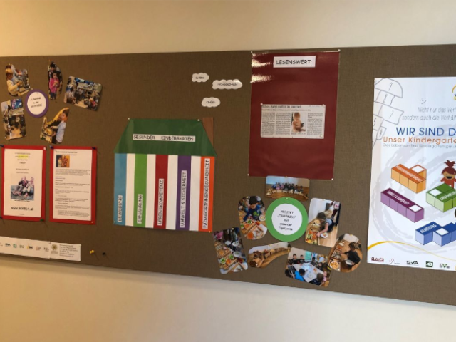 Nachdem wir seit Herbst 2019 beim Gesunden Kindergarten dabei sein dürfen, wollten wir das Projekt bei den Eltern sichtbar machen und Inhalte veranschaulichen. Uns war wichtig, dass die Tafel zum Hinschauen verleitet, Aktuelles gut ersichtlich ist und auch für theoretische Inputs Platz ist. Es sollte übersichtlich sein und nicht durch ein Zuviel überfordern. Mit dem Ergebnis sind wir sehr zufrieden und sowohl Eltern wie auch Kinder verweilen gerne um sich über Neues zu informieren.