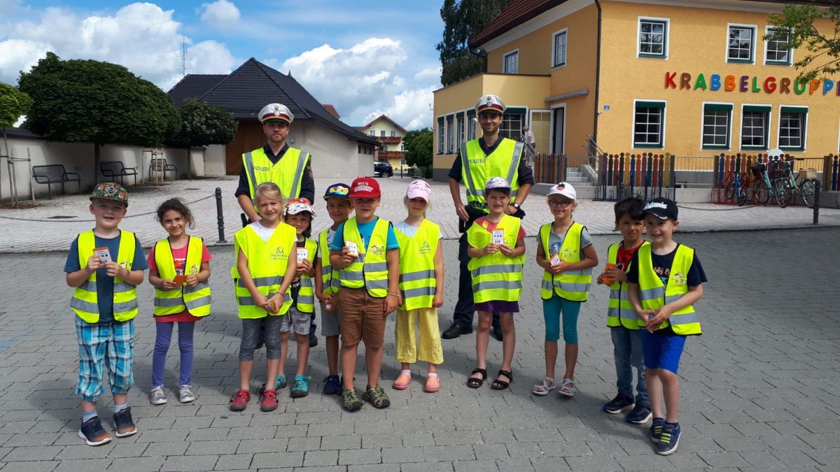 Gemeinsam mit den Polizisten des örtlichen Polizeipostens durften die Schulanfänger der blauen Gruppe ihren Schulweg kennenlernen. Besonderes Augenmerk wurde auf das Überqueren ungeregelter Schutzwege gelegt. Die Polizisten agierten sehr kindgerecht und vermittelten das Thema mit großer Begeisterung. Zum Abschluss bekamen alle Kinder den "Fußgängerführereschein". Weitere Zusammenarbeit wird von allen Beteiligten ausdrücklich erwünscht.