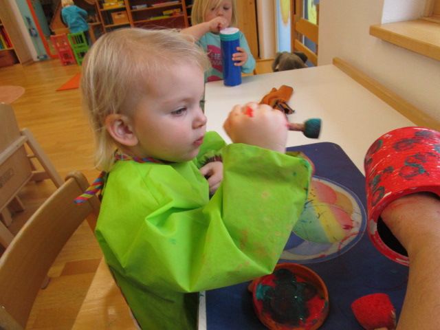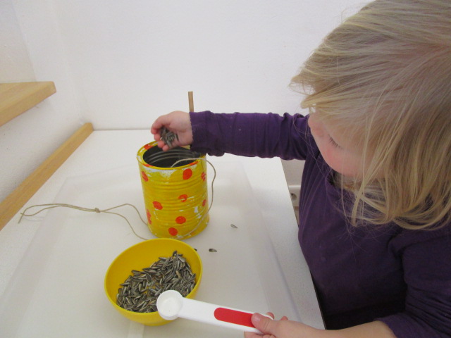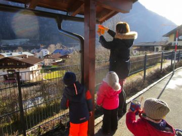 In unseren Garten haben die Kinder Vögel beobachtet und daraus ergab es sich, dass wir im Morgenkreis über die Tiere im Winter sprachen. Da den Vögeln in dieser kalten Jahreszeit nicht so viele Futterquellen zur Verfügung stehen, haben die Kinder vorbereitete recycelte Dosen bunt bemalt. Danach wurden diese mit Sonnenblumenkernen befüllt und schließlich in unseren Garten befestigt.