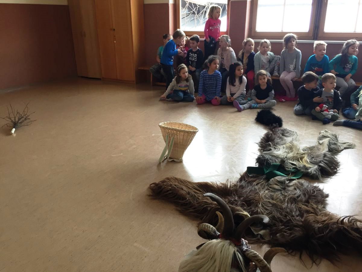 Deshalb durften die Kinder, welche Kostüme zu Hause hatten, diese mitbringen und es gab eine gemeinsame Anschauung. Natürlich nur freiwillig! Wir betrachteten das Fell, Rute, Maske und die Glocken und besprachen warum sich im Herbst einige Männer/Frauen als Krampusse verkleiden. Nämlich nicht um die "bösen Kinder" mitzunehmen.