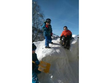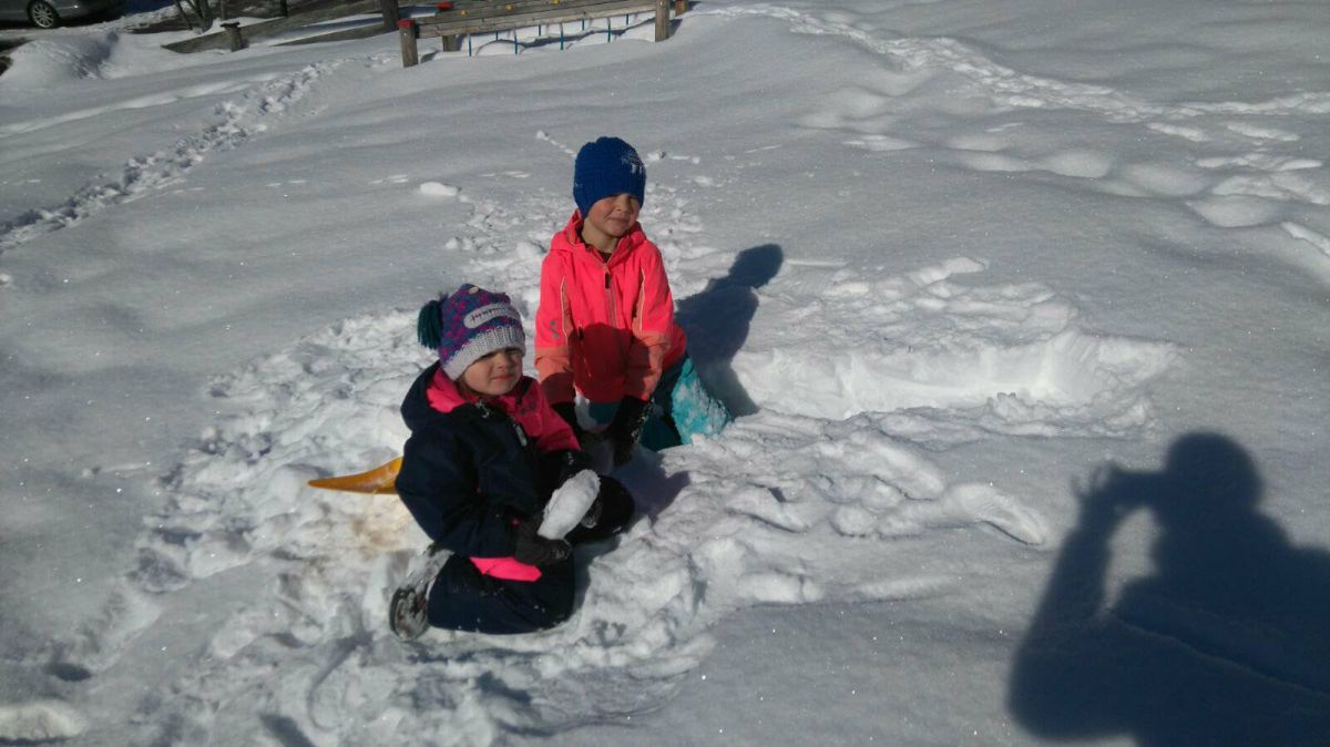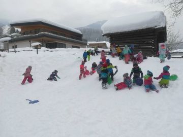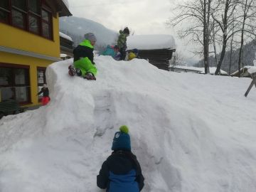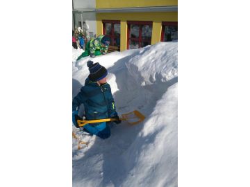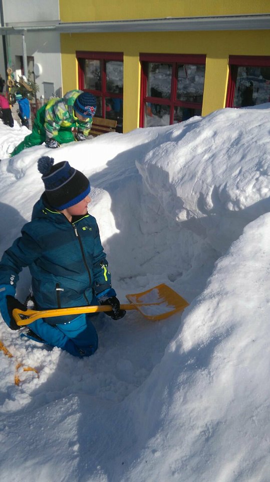 Der tiefe Winter dieses Jahr lässt die Kinderherzen höher schlagen. Mit viel Spaß und Bewegung werden unsere Schneeberge bewältigt. Zum Teil werden sie mit Schaufeln bearbeitet und andere nützen sie zum „Rutschblattlrutschen“. Die Schaukeln sind momentan eingeschneit. Die Kinder versinken im Schnee und bauen sich Wege bis zur Hängebrücke. Durch die großen Schneemengen ist Spaß garantiert!