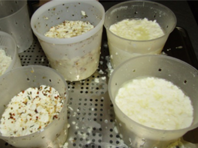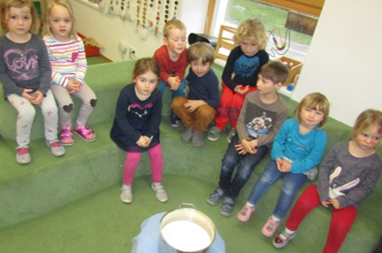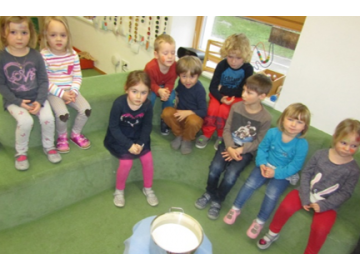Wir haben 2l Milch auf Körpertemperatur erwärmt und 20ml Joghurt zum Ansäuern dazugegeben. 20 Minuten später haben wir 10 Tropfen flüssiges Lab hinzugefügt. Nach einer Stunde haben sich die festen Bestandteile der Milch von der Molke abgesetzt. Durch das Schneiden der dickgelegten Milch entstand der Käsebruch. Diesen haben wir in Käsebecher abgefüllt, gesalzen und Kräuter hinzugefügt. Nach ca. 4x hin- und herwenden, sah der Käse nun so aus und durfte die ganze Nacht in der Bienengruppe reifen. Am nächsten Tag konnten wir uns unseren selbstgemachten Käse schmecken lassen.