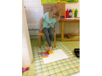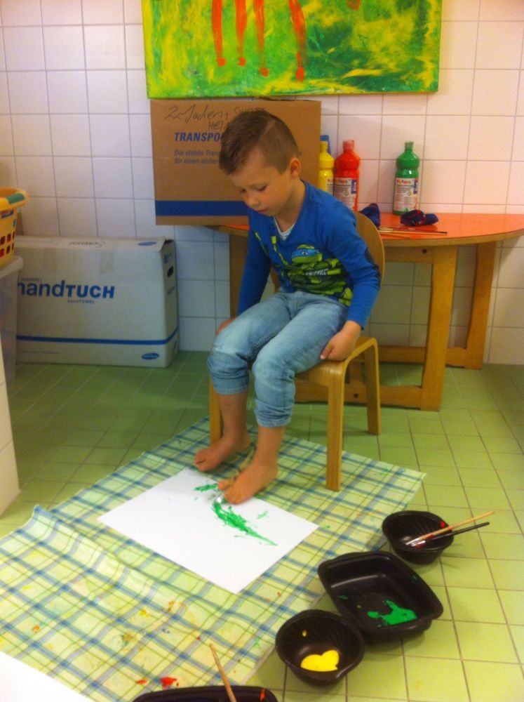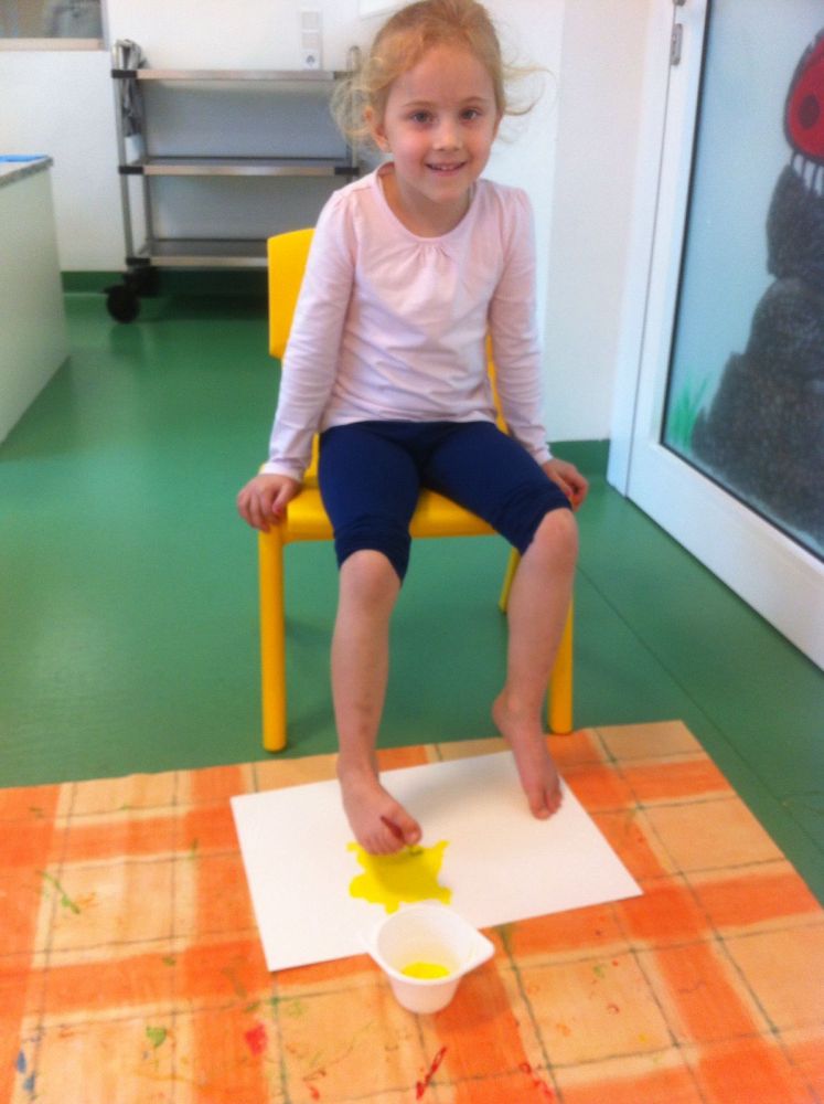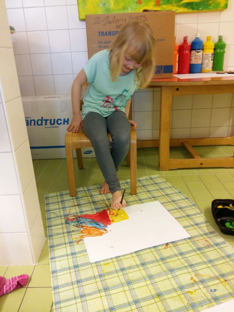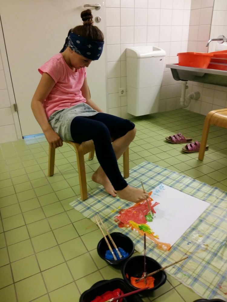 Wir beschäftigen uns schon einige Zeit intensiver mit unseren Füßen und Zehen und haben sie massiert, damit geturnt und balanciert, waren kneippen und seit Neuestem sind wir unter die Fußkünstler gegangen. Gar nicht so einfach nur mit den Zehen zu malen, aber es macht Riesenspaß!